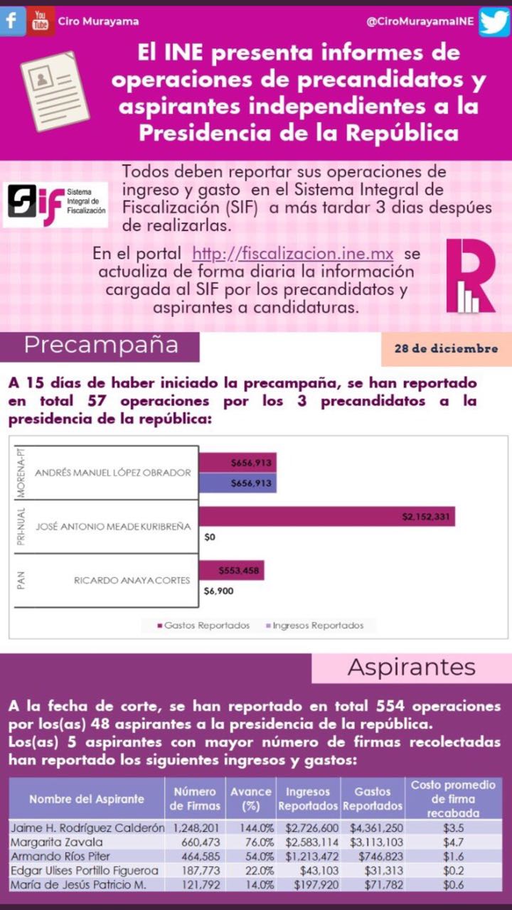 El INE informó que con corte al pasado 26 de diciembre, “en conjunto las y los aspirantes independientes a la Presidencia han reportado 9.17 millones de pesos de ingresos y 9.46 de gastos. Cabe destacar que los aspirantes que más apoyos ciudadanos han recabado, reportan mayores gastos que ingresos en el Sistema Integral de Fiscalización (SIF). Tanto Jaime Rodríguez como Margarita Zavala tienen más gastos que ingresos”, detalló el organismo.
