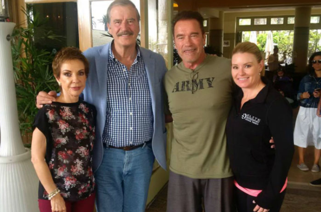“Pasé un rato con mi amigo Arnold Schwarzenegger, con quien tuve una interesante y amigable conversación”, compartió Fox en sus redes sociales junto a la fotografía en la que se le ve acompañado de su esposa Martha Sahagún, el «Governator» y otra mujer.