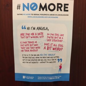Haylet Child es la coordinadora de esta estrategia y también se encuentran bajo su cargo algunas otras contra el abuso de sustancias, la violencia y el abuso sexual del Consejo del Condado de Lincolnshire y explicó que los carteles «Pregunta por Angela» son parte de una campaña #NoMore (#NiUnaMenos).