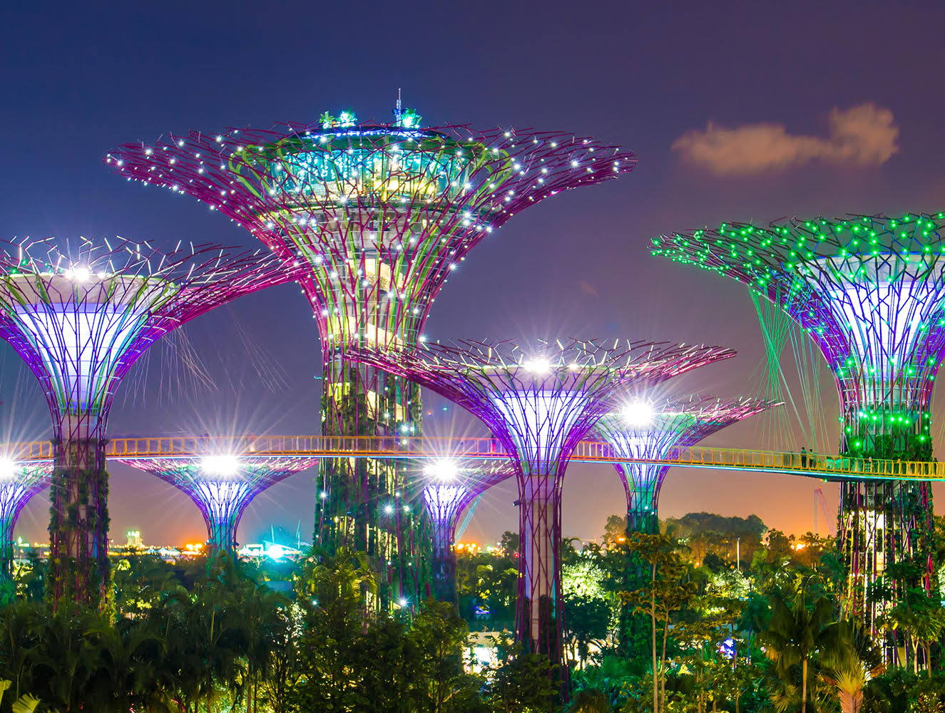 Además se puede caminar sobre los puentes de la estructura para apreciar todo el proyecto desde las alturas, sin embargo otro de los atractivos turísticos de este lugar es la iluminación que por la noche adorna los árboles, lo que se convierte en todo un show que parece salido de las películas.