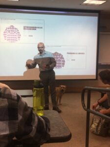 Este profesor decidió llevar a su perrita Maggie a su clase de Política y Ley del consumidor, que es impartida en horario nocturno, lo cual resulta ser una barrera para la asistencia, sobre todo porque su clase es la última del día.