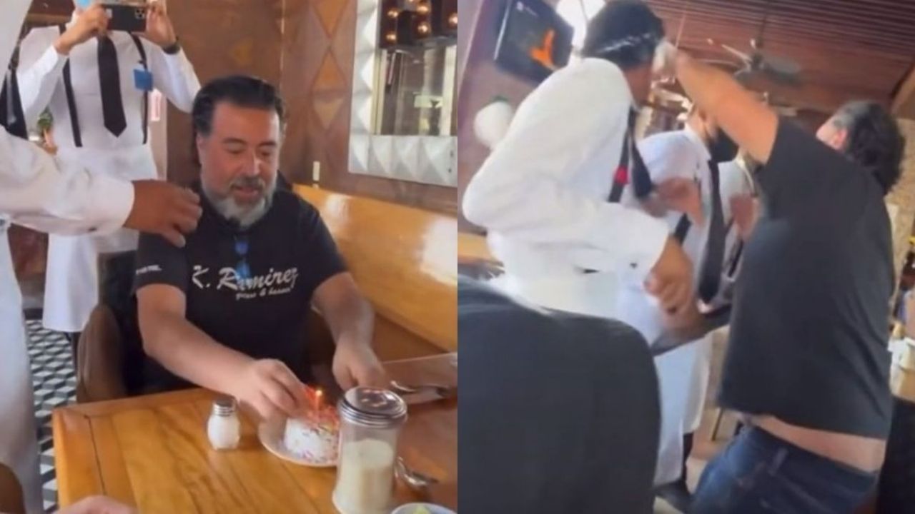 Pero de pronto, Micky Huidobro tomó el pastel y lo embarró en el rostro del mesero que tenía a su frente. Además del primer pastelazo, el vocalista de Molotov intentó terminar el pastelazo yéndose contra otro mesero a su paso, pero no tuvo éxito.