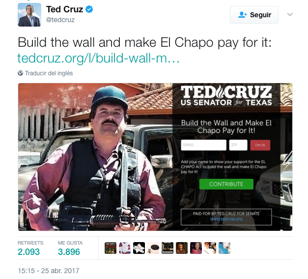 Ciudad de México, 26 Abril.- El senador republicano y ex candidato a la presidencia de Estados Unidos, Ted Cruz, lanzó una propuesta de ley para que todos los fondos que sean incautados a Joaquín «El Chapo» Guzmán, sean utilizados para financiar la construcción del muro fronterizo.